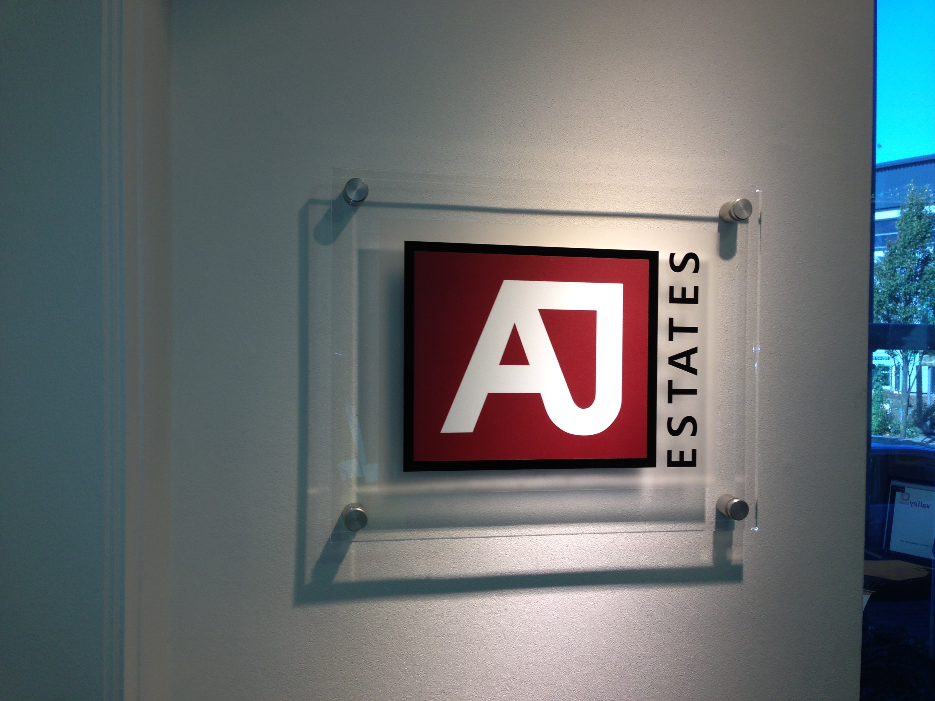 Brushed stainless steel boardroom and meeting room logo together with glass-look acrylic panel in internal office space.