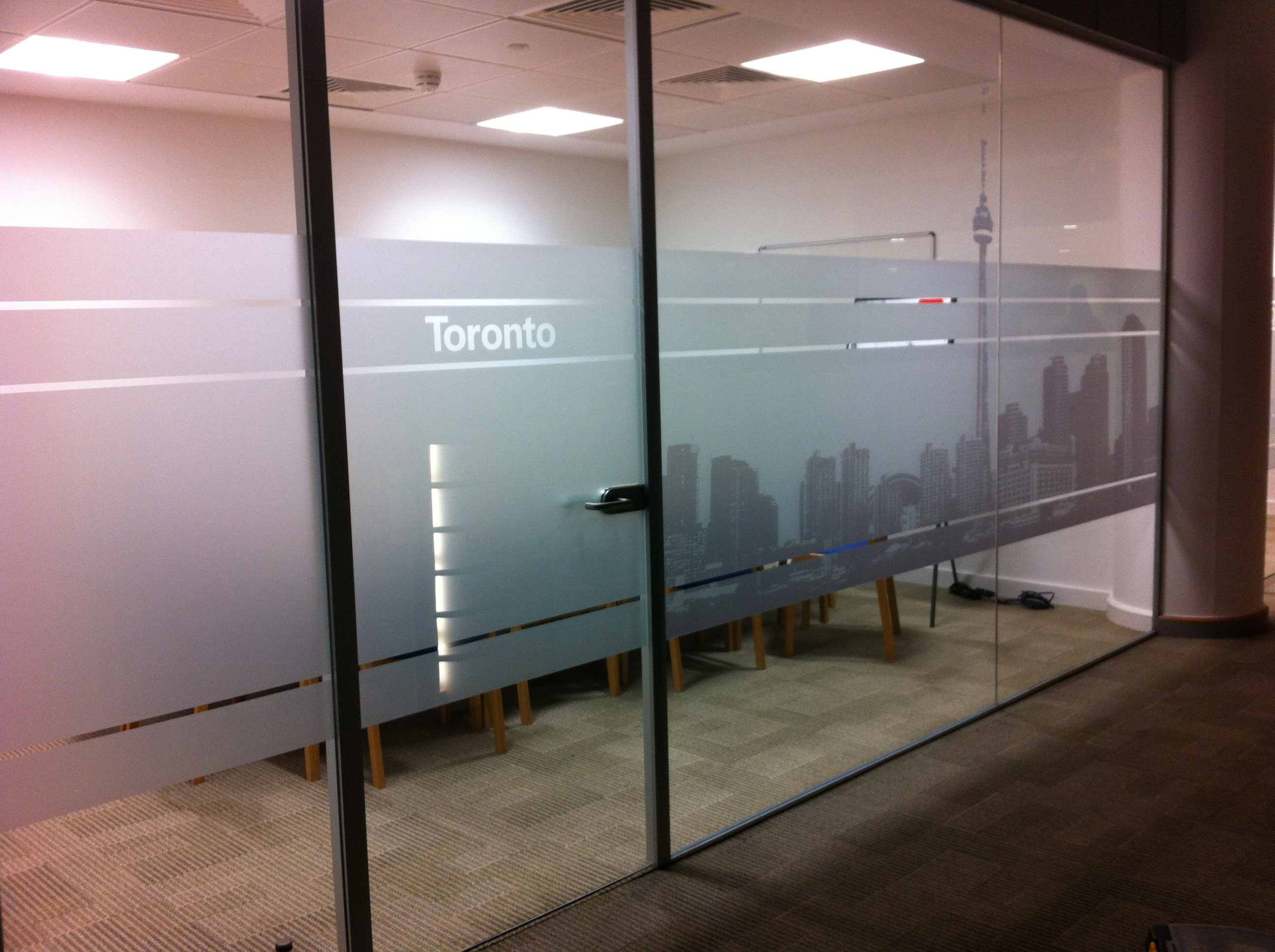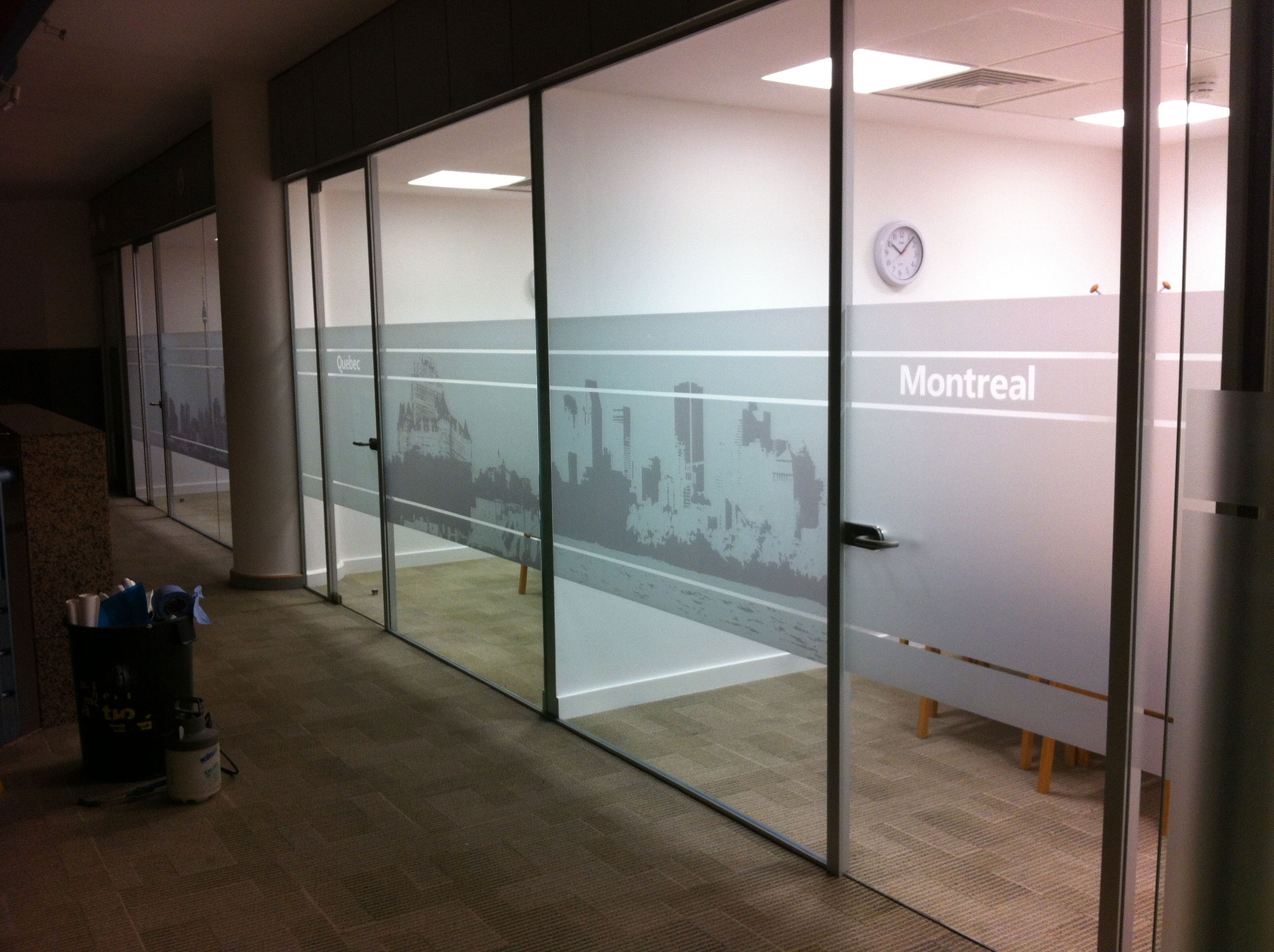 Digitally printed frosted manifestations help you to depict more detailed images and scenes within your internal office space. Canada Life chose to pick out the skylines of the cities in which they are located globally on various of their internal office glass partition walls.