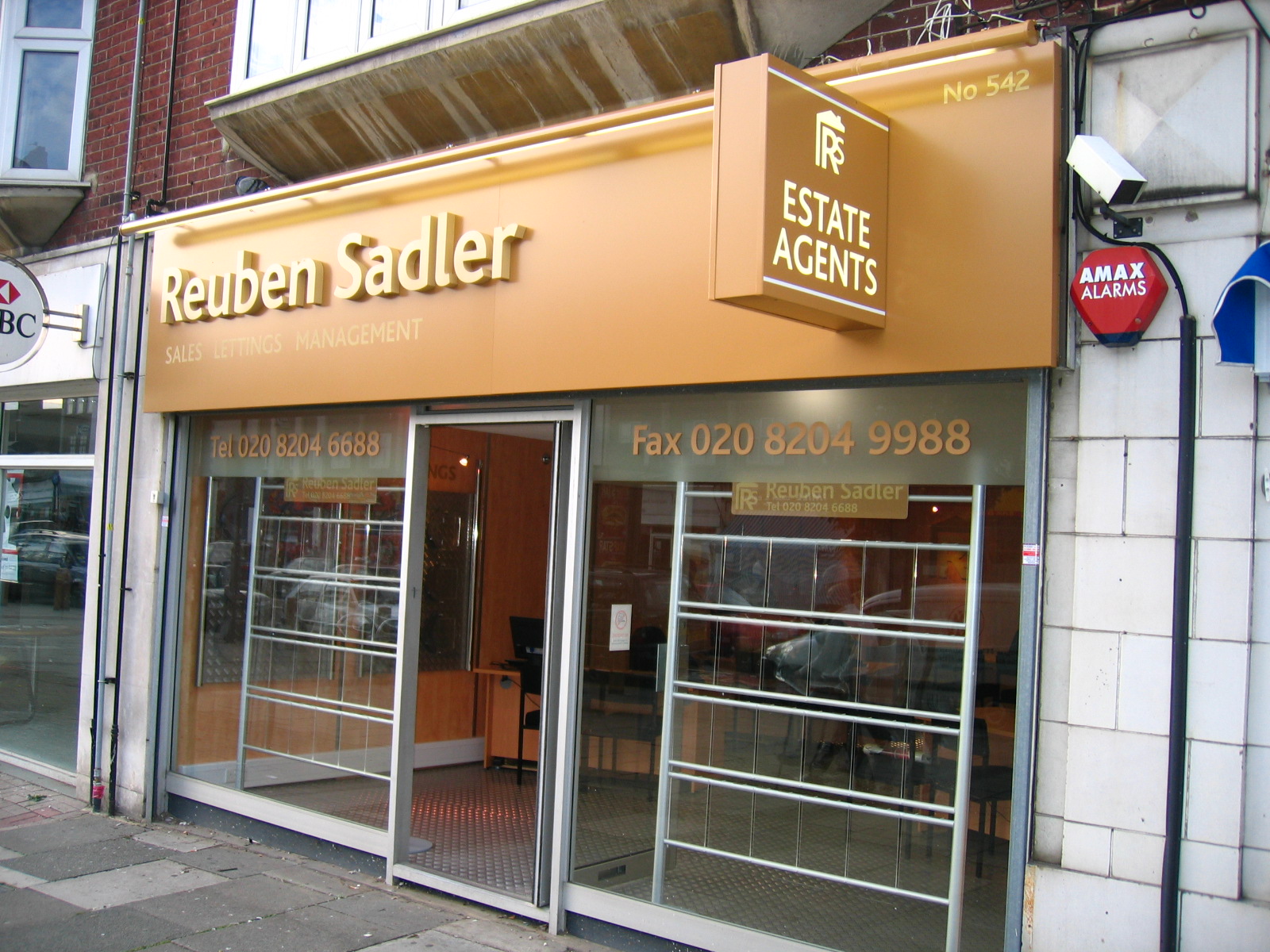 Estate Agent Shop Sign with Projection Sign A folded aluminium tray with built up painted metal letters and a projection sign also carrying the corporate logo for a London estate agent. Shop SignsProjection Signs Share this sign
