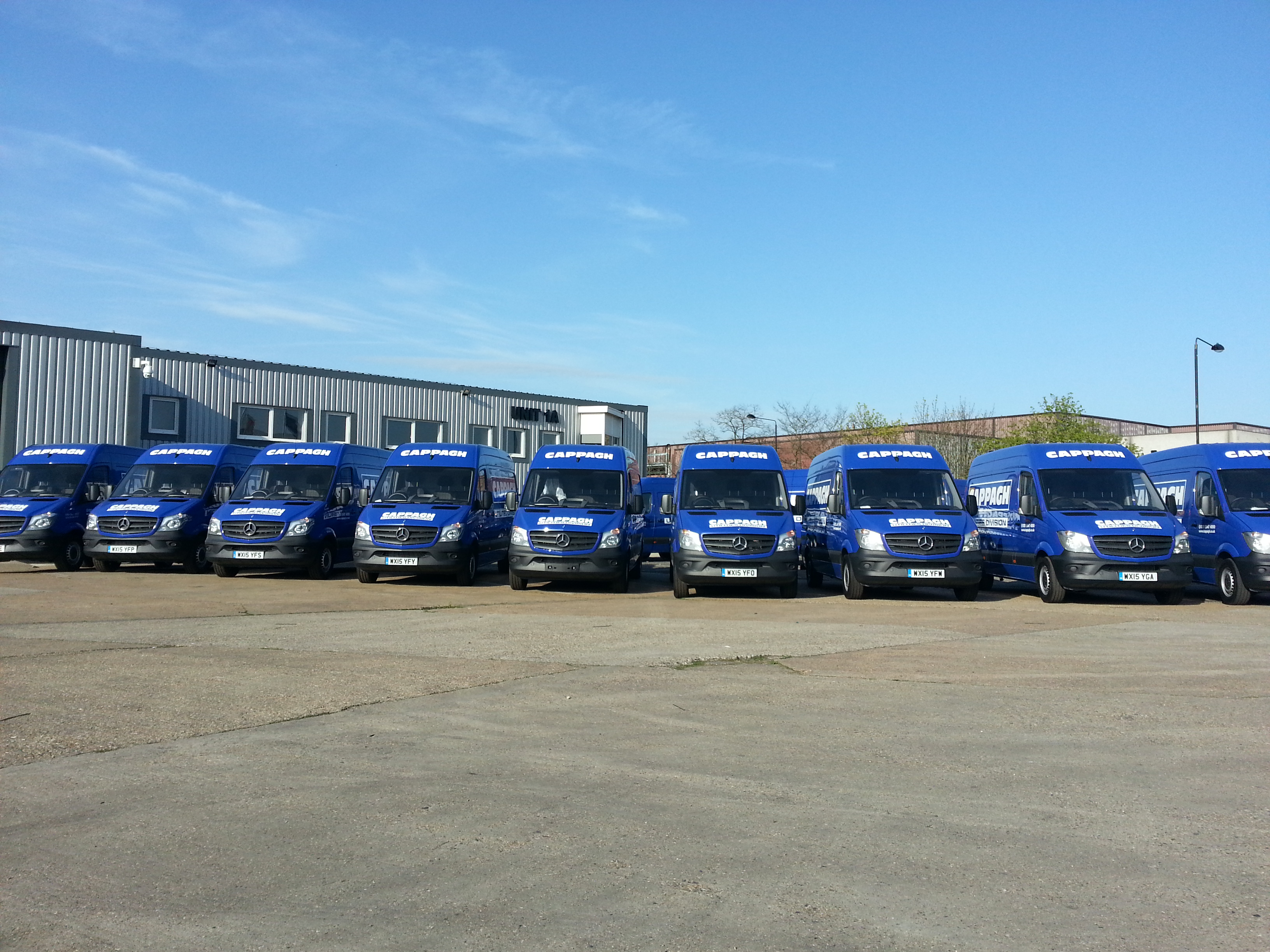 Mercedes Sprinter Van Fleet Vehicle Graphics Fleet of Mercedes Sprinter vans in London immediately post vehicle wrap installation by Action Signs. Vehicle GraphicsVan SignsChevron Share this sign