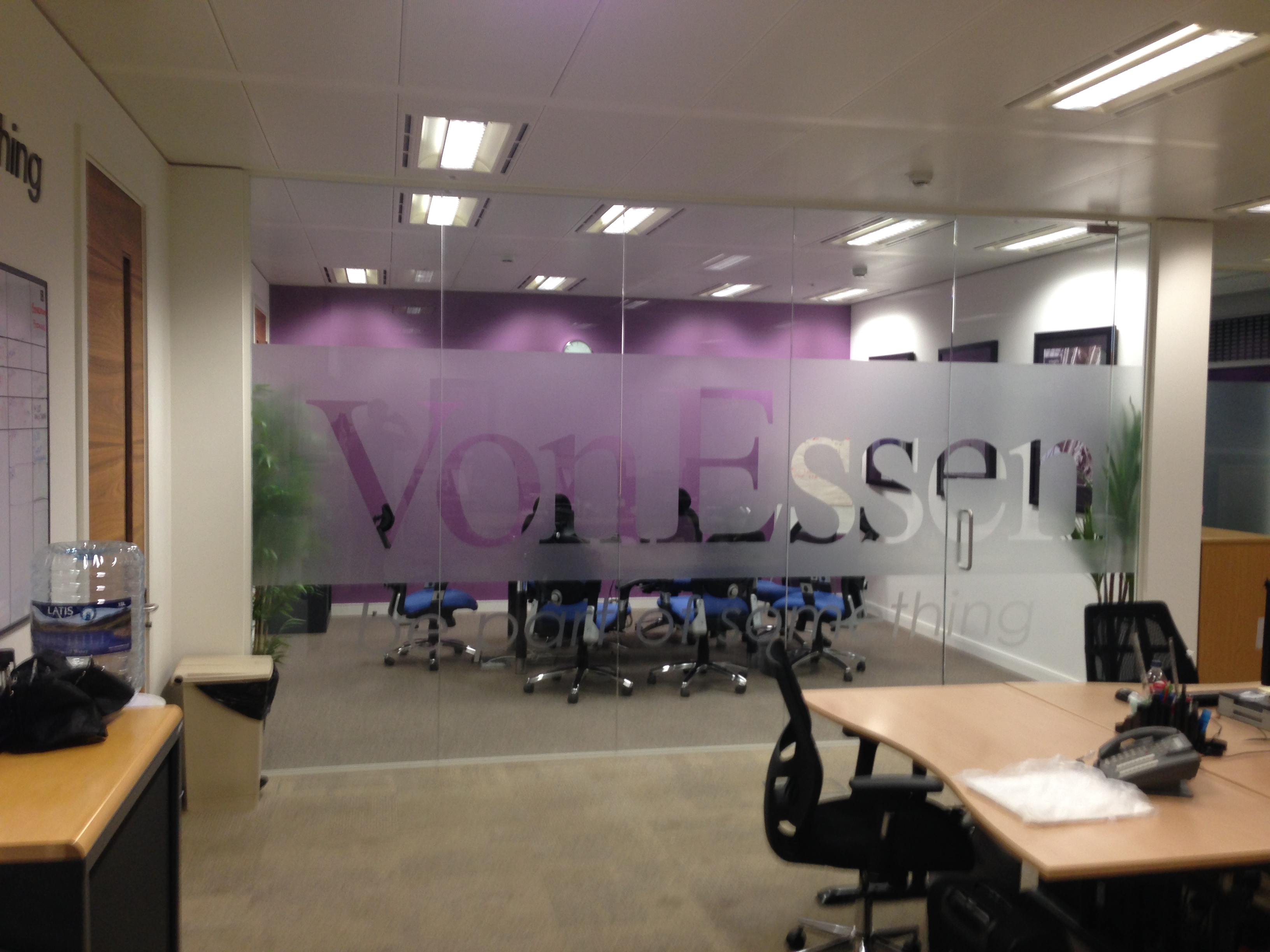 We applied a sandblast-effect film to this this office boardroom. Frosted film serves the twin purpose of creating a sense of internal privacy and marketing your business to visitors.